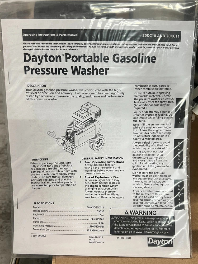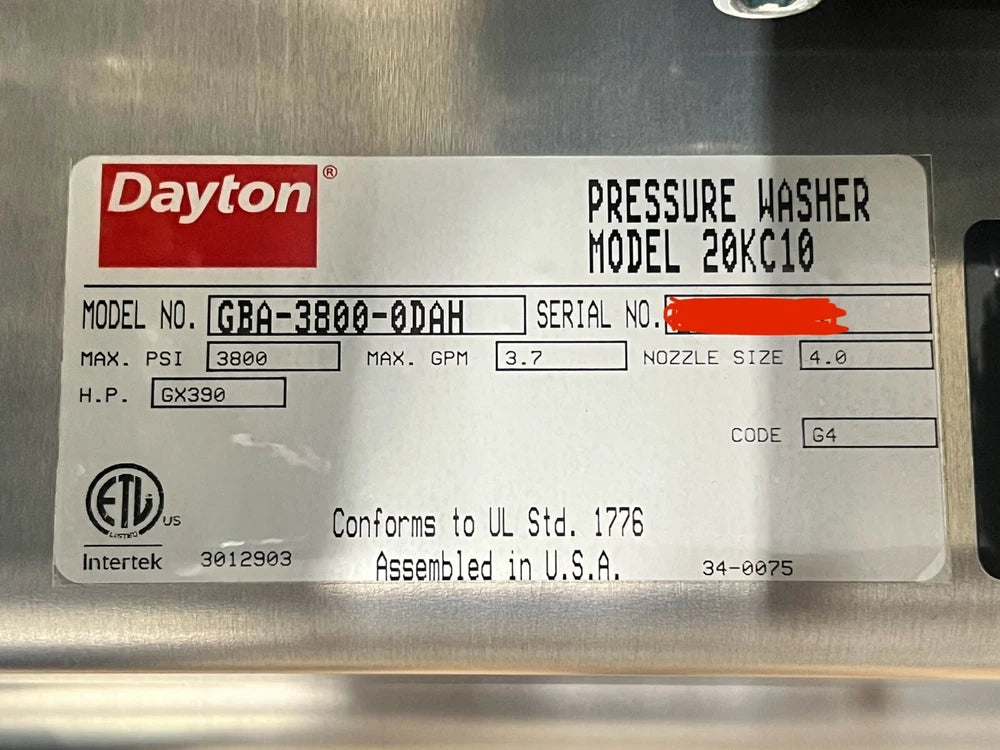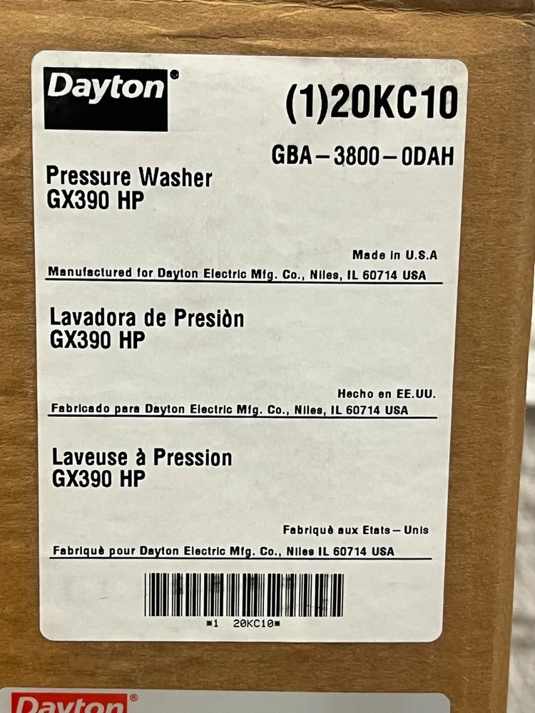 NEW Commercial DAYTON 20KC10 Pressure Washer 3,800 psi Cold 13 HP GBA-3800-0DAH